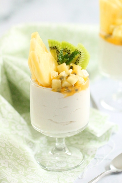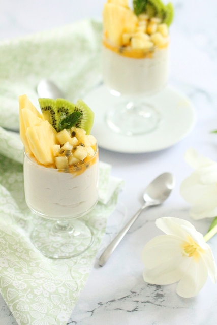 Au moment de servir, disposez harmonieusement les fruits exotiques sur la mousse bien froide. Nappez éventuellement d’un peu de jus de fruits de la passion et terminez par quelques feuilles de menthe pour une touche de fraîcheur. Servez aussitôt et dégustez bien frais.