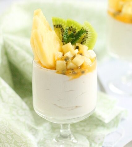 Sa texture légère comme un nuage contraste avec la fraîcheur acidulée de l’ananas, du fruit de la passion et du kiwi. Résultat : un dessert qui fait voyager, qui rafraîchit le palais, et qui trouve parfaitement sa place sur une table de réveillon, même après un repas généreux.
