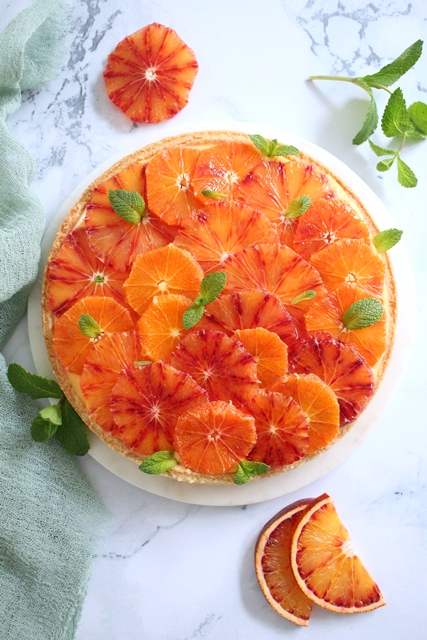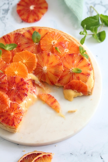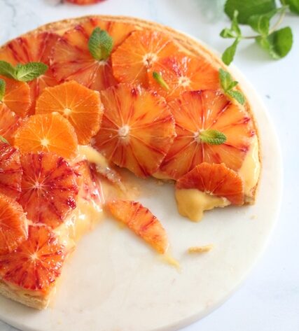 Aujourd’hui, je vous propose de découvrir une recette à base d’un fruit parfaitement de saison : une tarte crémeuse à l’orange sanguine.