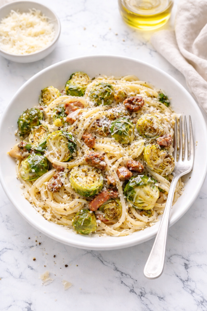 Il y a des plats qui cocheraient presque toutes les cases : faciles, rapides, réconfortants… et photogéniques. Ces pâtes crémeuses aux choux de Bruxelles braisés et lardons en font clairement partie.