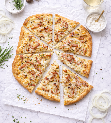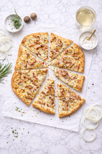 La force de la flammekueche réside dans sa simplicité. Peu d’ingrédients, mais une exécution précise :