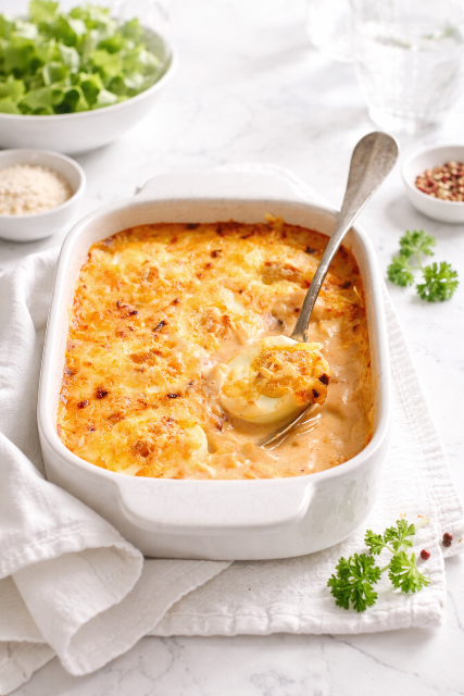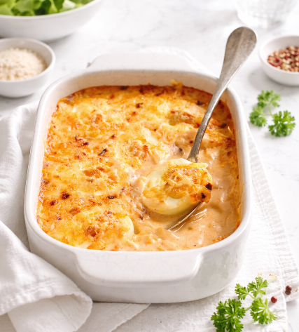 Les œufs sauce Aurore sont un parfait exemple de la cuisine bourgeoise française : accessible, nourrissante et savoureuse. Le principe est simple, des œufs durs nappés d’une sauce Aurore, mais le résultat est toujours réconfortant.