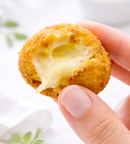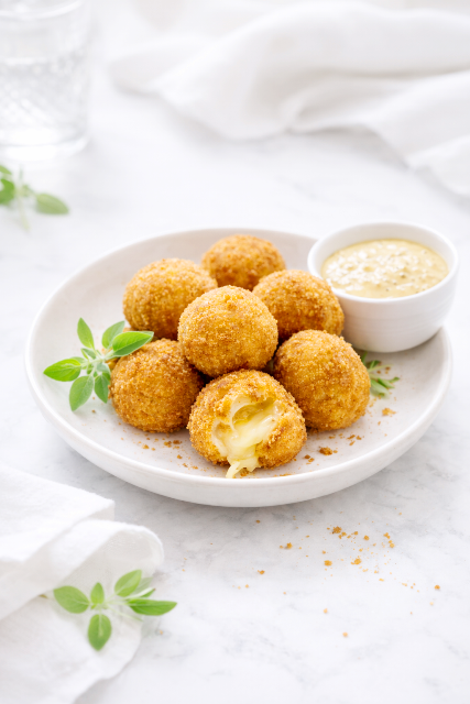 Ici, le Comté est sublimé avec une touche de vin blanc du Jura qui vient renforcer ses notes fruitées et légèrement noisettées. Le tout est ensuite figé au froid, façonné, pané… puis plongé dans l’huile chaude pour créer ce contraste de textures si addictif.