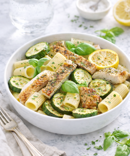 L’été ayant du mal à s’installer, on opte pour une salade tiède et complète, mêlant pâtes, courgettes et poulet rôti et délicatement parfumée au citron …