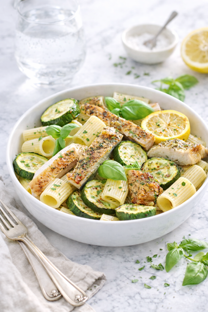 L’été ayant du mal à s’installer, on opte pour une salade tiède et complète, mêlant pâtes, courgettes et poulet rôti et délicatement parfumée au citron …