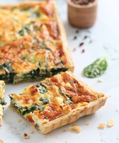 Une pâte brisée maison, une fondue d’épinards frais et de délicieux crottins de chèvres constituent la recette du jour dans une quiche réconfortante et de …